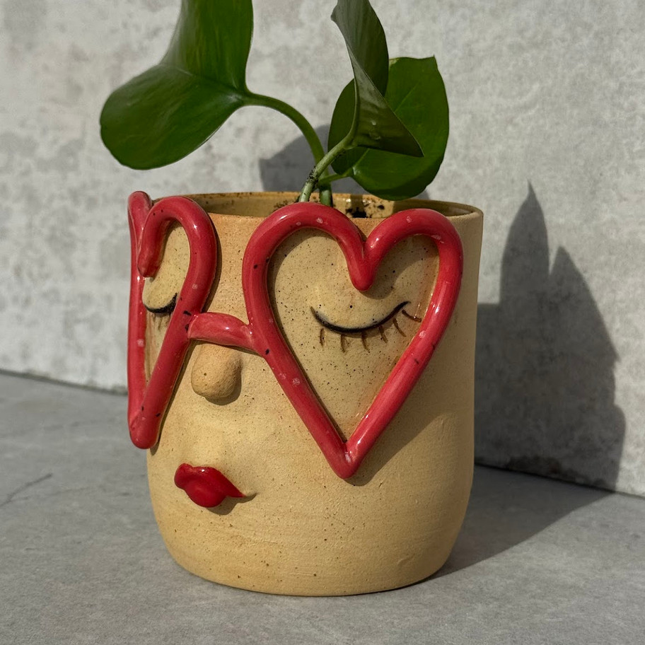 Bring a little personality to your plants! Handmade ceramic planter with a playful face wearing heart-shaped glasses, adding charm and fun to any space.